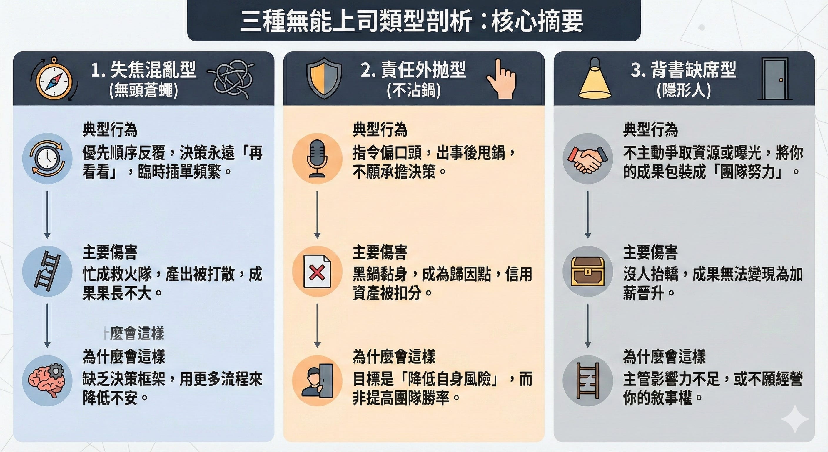 為什麼會這樣: 他缺乏擔當。當沒有留痕與責任邊界,你做得再好,都抵不過一次被甩鍋的傷害。