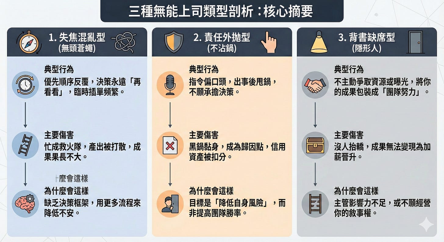 你不需要忍耐到離職,先看懂三種無能模式,選對打法,把成果與敘事留在自己名下
